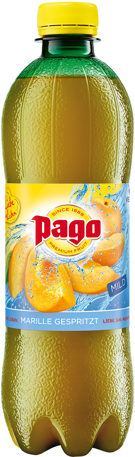 Pago gespritzt - unser beliebter Fruchtgenuss mit Marille kombiniert mit mild prickelndem Wasser.