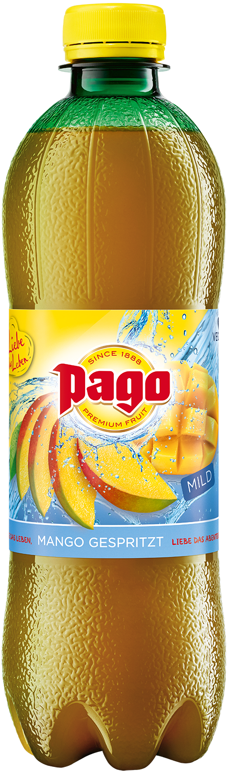 Pago gespritzt - unser beliebter Fruchtgenuss mit Mango kombiniert mit mild prickelndem Wasser.